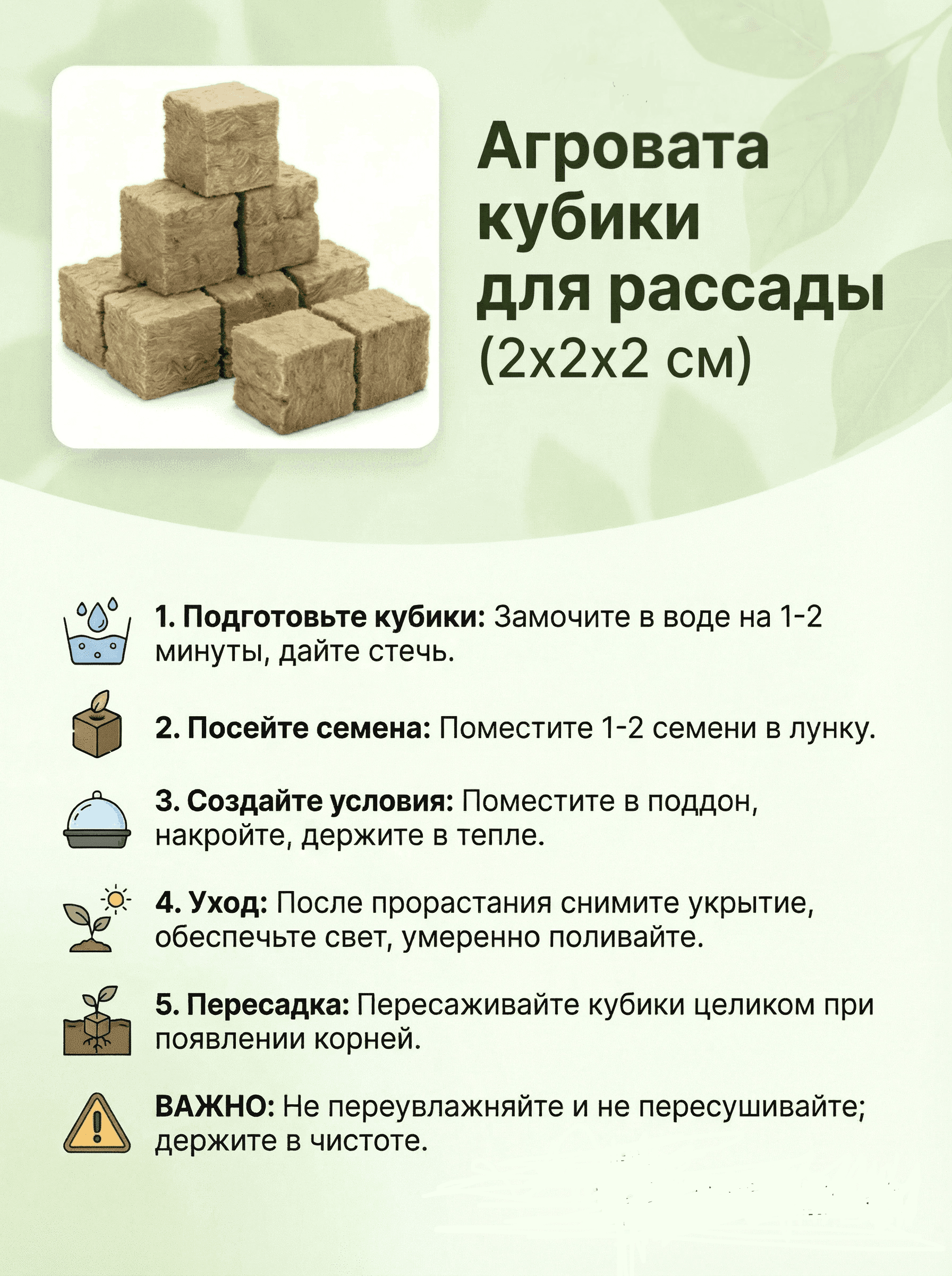 Не упустите возможность облегчить процесс рассады и повысить урожайность с помощью удобных и эффективных кубиков пробки агровата минеральная! Позаботьтесь о своих растениях уже сегодня, выбрав надежный и эффективный продукт для их роста.