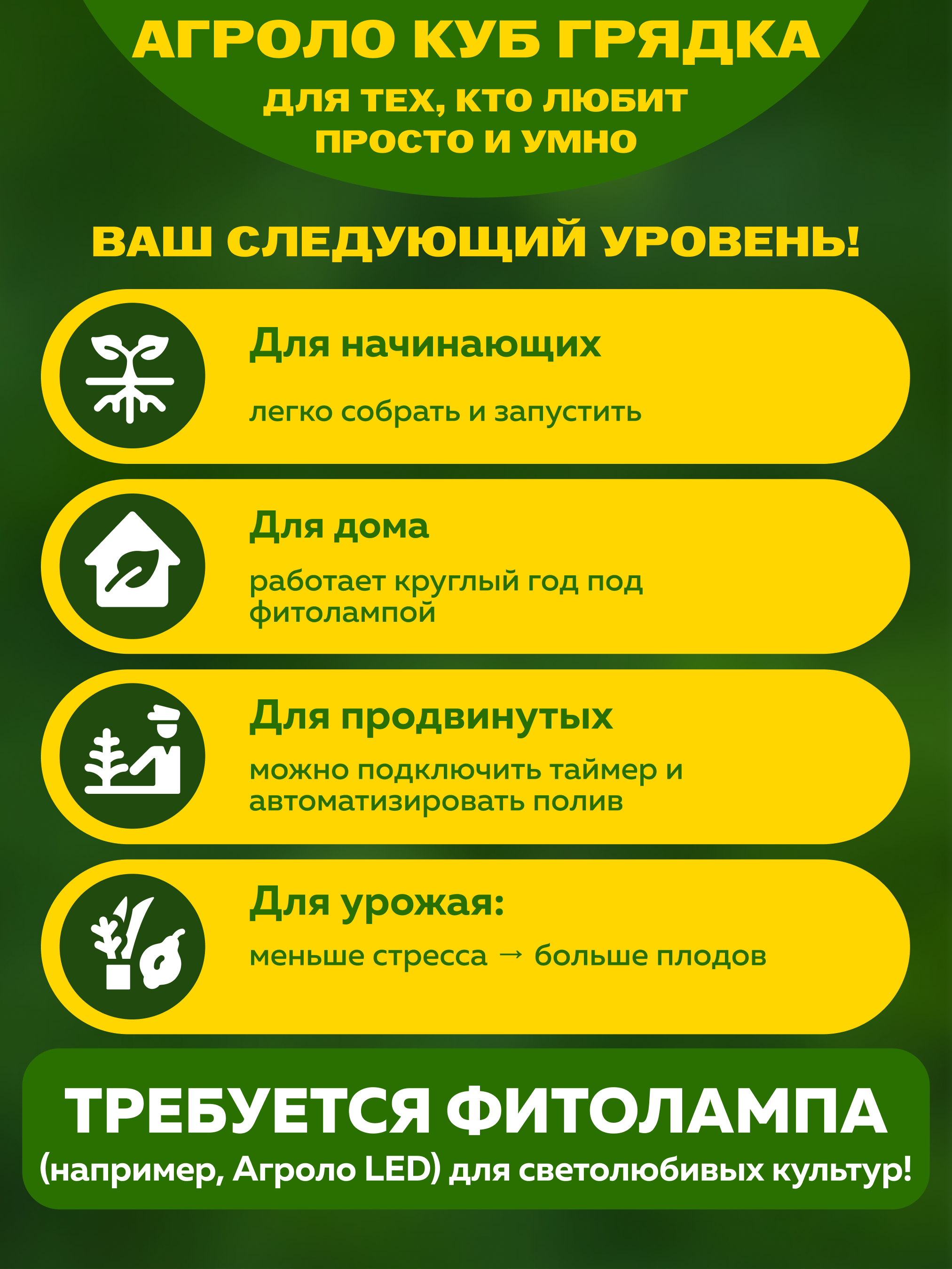 С помощью данной установки вы не только сможете наслаждаться свежими зелеными травами, овощами на своем столе, но и получить удовольствие от самого процесса выращивания. Совершенствуйте свои навыки и экспериментируйте с различными культурами. АГРОЛО КУБ Оптимум – это ваш надежный помощник в мире гидропоники, который сделает ваше выращивание более продуктивным и эффективным.