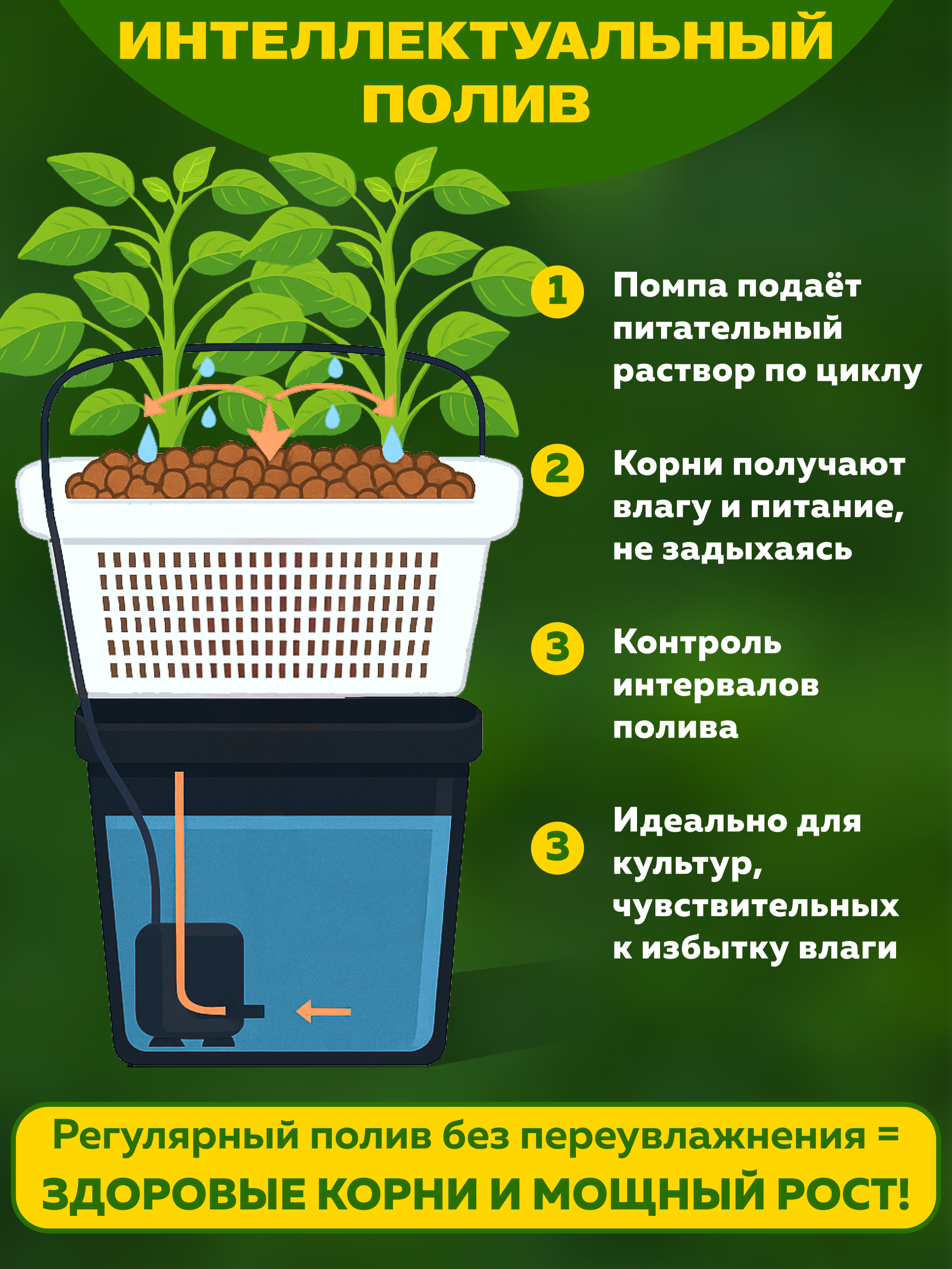 В отличии от глубоководной гидропоники (DWC) система позволяет выращивать растения, критичные к заливу корней. При помощи таймера (в данный комплект не входит) можно настроить расписание полива растений и выращивать огромный спектр растений.